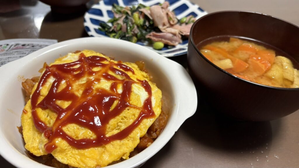 夜:オムライス 生ハムとほうれん草と枝豆のガーリック炒め 味噌汁