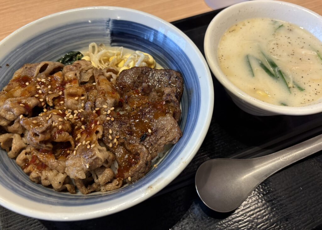 名物はカルビ丼みたいですが、厚切りハラミも乗っている「2種盛りカルビと厚切りハラミ丼」を選びました。たれがたっぷり絡まったお肉が食欲をそそります。